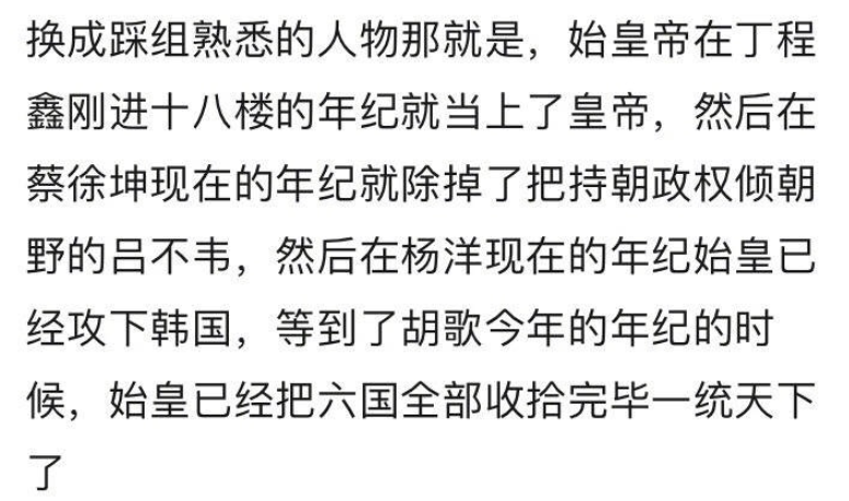 13即王位,21岁平内乱,29岁开始灭六国,38岁称皇帝,随后完全大一统,放到现代的爱豆行业,奇迹粉们可以狂吹上下五千年了。