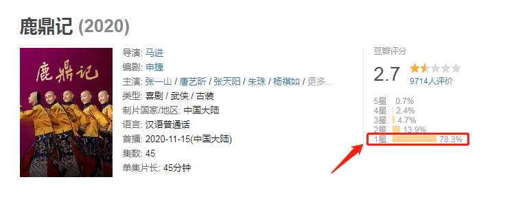 新版《鹿鼎记》在某瓣评分更是低到了2.7分,是所有《鹿鼎记》版本分数最低的一版,更是占据了金庸小说电视剧评分倒数第二的位置,超78.3%的观众给出了一星的评价,只有0.7%的观众给了5星好评。