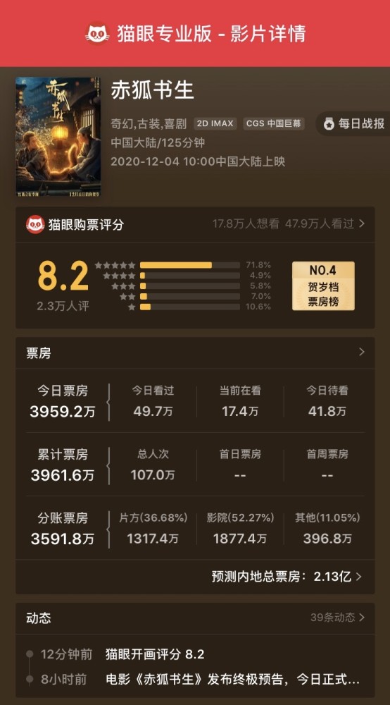 12月4日,李现 和陈立农 主演的电影《赤狐墨客》上映,猫眼评分8.2分。