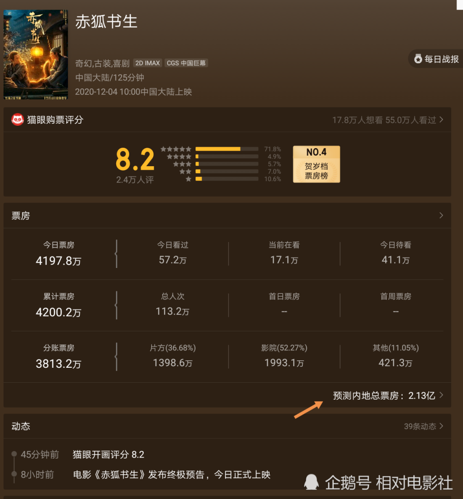 此外,据某平台大数据票房预测,这一次《赤狐墨客》的最终内地票房,或仅为2亿元出头,也并未有太大惊喜。