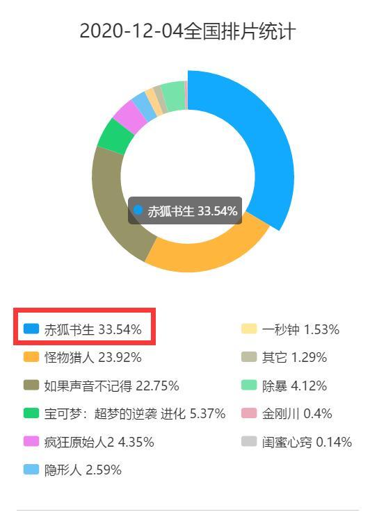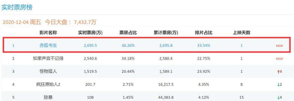 话虽如此,但足够的营销确实能起到事半功倍的效果。12月4日,电影《赤狐墨客》正式上映。与大家预期的一样,电影一上映就荣登当天票房冠军的地位。这除了与营销有关系外,排片占比也是不容忽视的。
