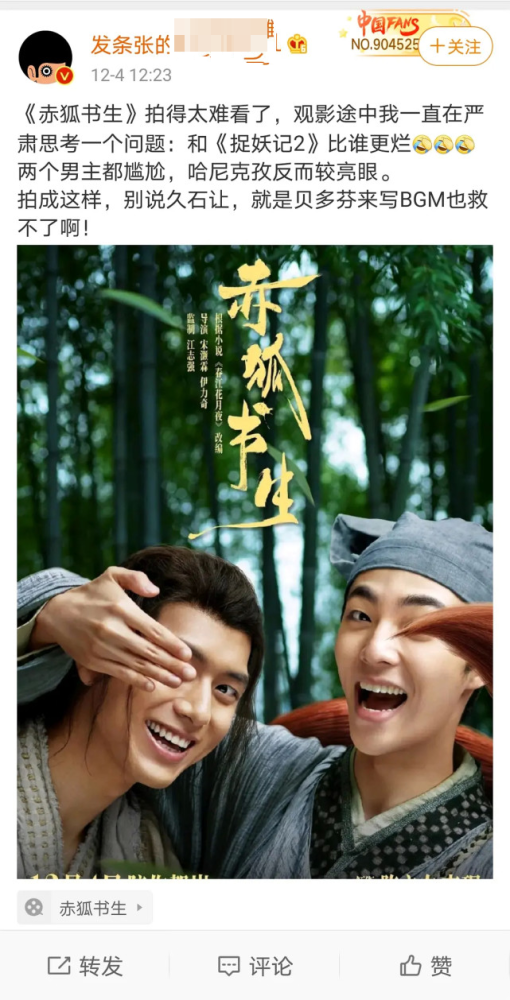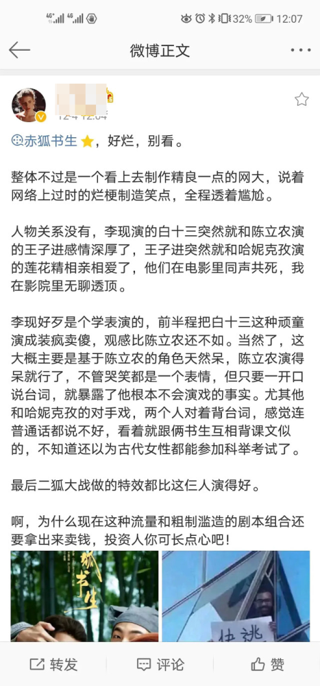 不少影评人发文评价《赤狐墨客》太烂了,有博主直言两位男主表现尴尬,唯独女主哈尼克孜比较亮眼。