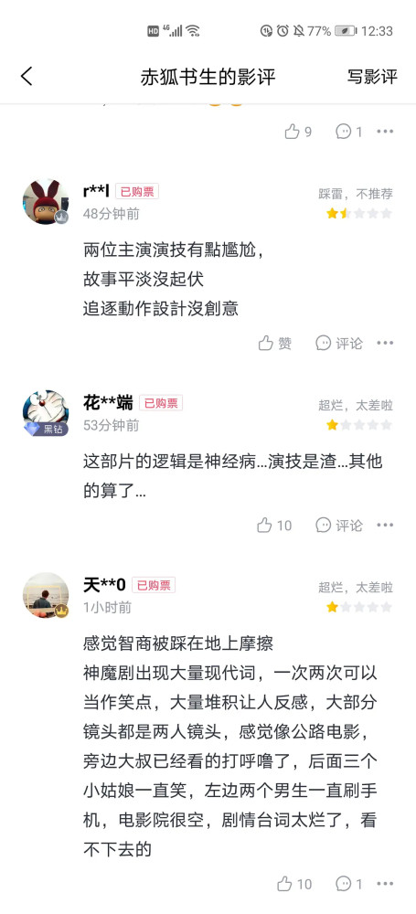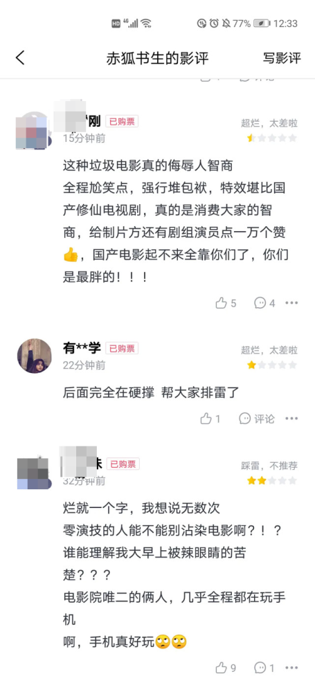 影评人看电影眼光犀利,对电影自然会严酷一些。然而,大多观看了电影的观众都赞成博主的观点,直言《赤狐墨客》是烂片,全程尬笑点,欺侮观众的智商。有网友还描述了电影院的情况:“旁边的大叔已经看得打呼噜了,后面三个小姑娘一向笑,左边两个男生一向刷手机……”