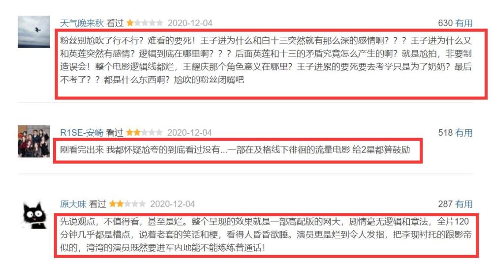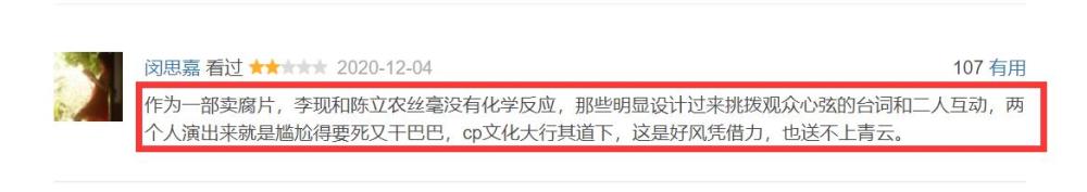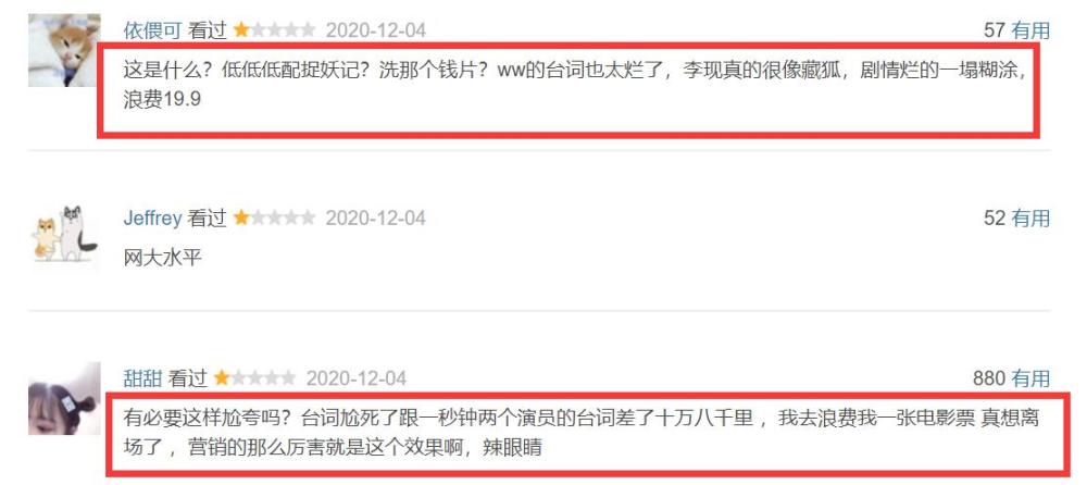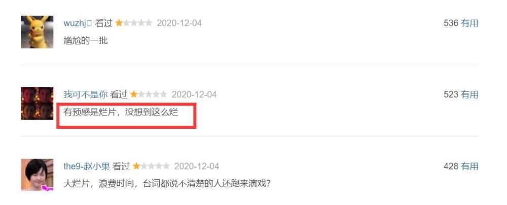 翻看电影的点评,不难发现评价电影烂和主演演技尴尬的网友不在少数:“台词尬死了跟《一秒钟》两个演员的台词差了十万八千里 ”、“两个主角演技一个比一个烂”、“有预感是烂片,没想到这么烂”……