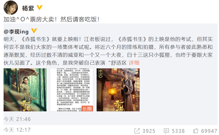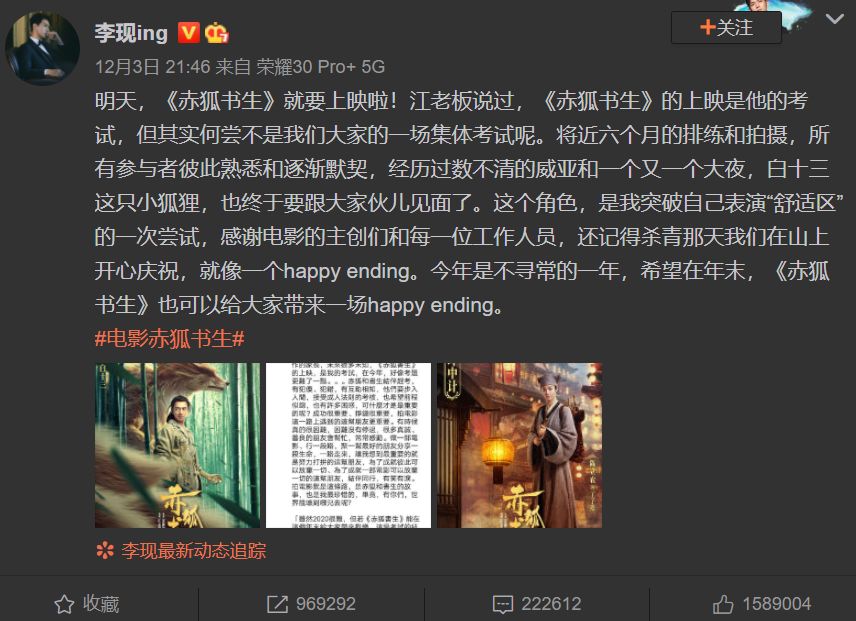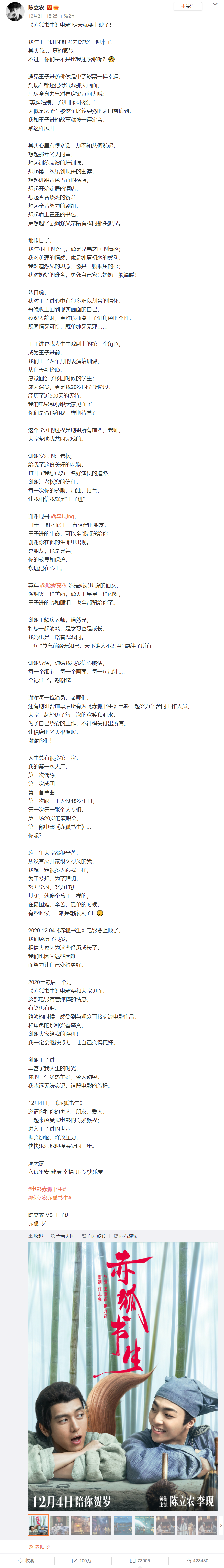 12月3日下昼,陈立农在微博发布长文,细数自己拍摄《赤狐书生》的经历。这条微博的转发量已经破百万了,评论量不到7万,点赞量超过了42万。12月3日晚上,李现也在微博发布长文,为《赤狐书生》造势。
