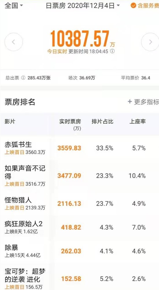序言:2020年12月4日,又是星期五,又是一大波新片上映的日子,排片最高的是《赤狐书生》,高达33.5%;排片第二高的是《怪物猎人》,高达23.7%;排片第三高的是《如果声音不记得》,高达23.3%;其他新片的排片很低,基本上就是炮灰了。