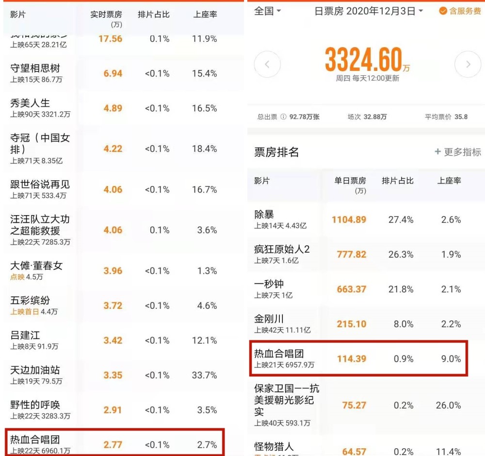 有新片上映,占据大量排片,就意味着会压缩老片的生存空间,比如刘德华主演的《热血合唱团》。12月3日,《热血合唱团》的排片只有0.9%,但上座率高达9.0%。12月4日,《热血合唱团》的排片已经小于0.1%了,和下线没什么区别了。