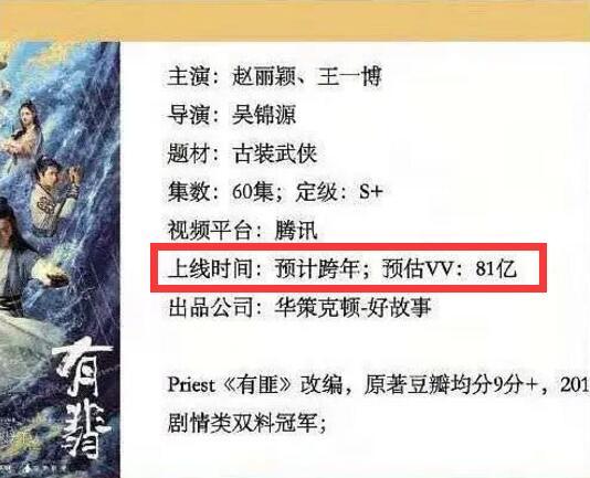 近日,有网曝由赵丽颖、王一博主演的《有翡》将定于今年的跨年时间段上线网播,而与上线时间同步曝光的还有鹅厂给《有翡》定的目标播放量。