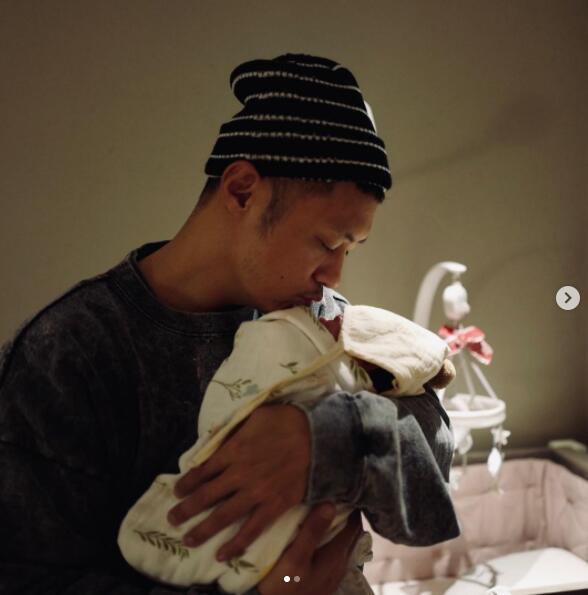 在晒出女儿小手后不久,余文乐又晒出了自己怀抱女儿亲吻的照片,从他身后的婴儿床能够看出,此处是在家中了。