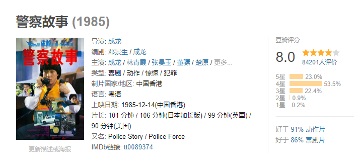 截至目前《警察故事》系列已有6部作品,并且都有着不俗的口碑,第一部《警察故事》豆瓣8.0,成龙是导演还担任主演,还有林青霞、张曼玉等实力派演员的加盟。