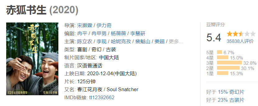 《赤狐书生》口碑方面也还行,豆瓣3.58万人参与评分打出5.4分,对于国产片来说及格了。都说古装片过时了,但如果拍得好还是很容易大卖票房的,最成功案例有《捉妖记》系列。奇幻题材永远都不会过时,从这个角度分析它的潜力是有的,要是放到火热的档期票房绝对5亿起步。