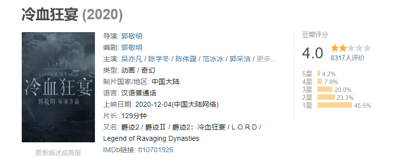 总的来说《冷血狂宴》故事稀碎,台词中二,漏洞百出,全片打来打去,打得还非常僵硬难看,小编非常难理解郭敬明为啥要把演员做成这样,也太毁他们的形象了,可能方便做特效,关键那特效就是网页游戏的水平啊。