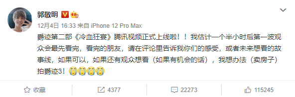 据说现在《冷血狂宴》票房还挺高,小编怀疑其中一大部分是粉丝买的,郭敬明的套路用的很是顺手啊,郭导已经掌握了另类财富密码啊。