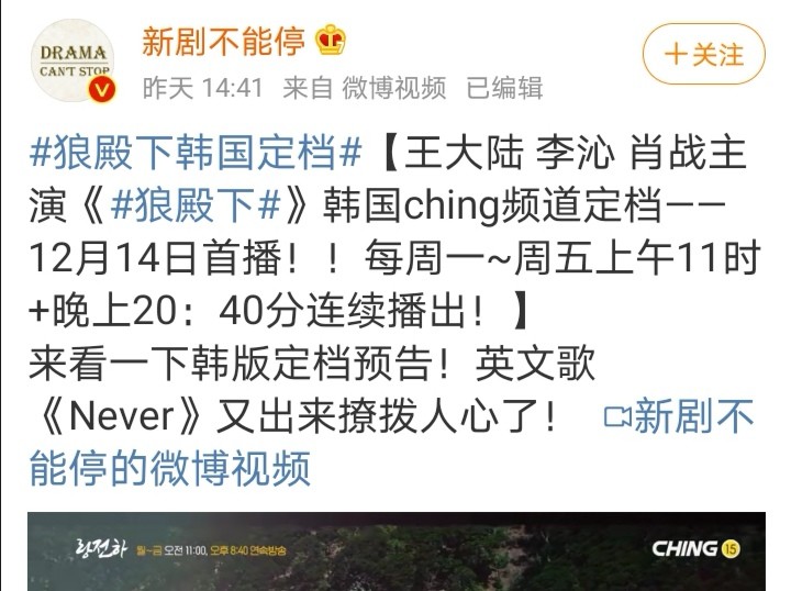 不光《斗罗大陆》被韩国引进,肖战近期热播的电视剧《狼殿下》也会在12月14日在韩国的某电视台播出。