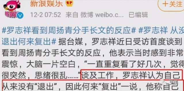 谈及工作,罗志祥大吹牛皮,认为自己“从没有退出,又何来复出一说”。