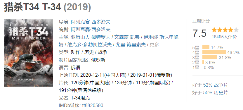《猎杀T34》俄罗斯票房大卖23亿卢布,它的本土片排名也是历史级别的。该片今天也登陆了国内市场,由于受题材影响它的开画票房一般,但观众的口碑反响非常好。在豆瓣上,网友打出了7.5分高分,这个分数好于52%的战争片,以及好于55%的历史片。