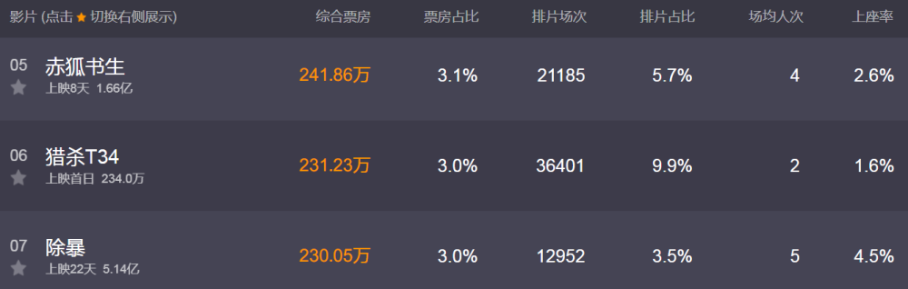 《猎杀T34》国内口碑不俗,但是由于它的排片量不高,所以致使开画成绩一般。今天只放映3.64万场,排片占比9.9%,它晚上的黄金场次也不多。截止20点,实时票房收231万元,排名第六位。以这部电影的实力来说它被低估了,但也没办法当前内地市场低迷,只能说它输给了运气。
