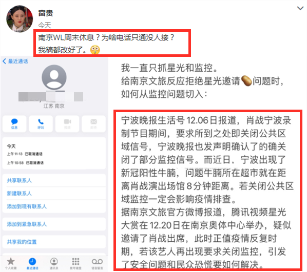 从12月初开始,大富贵就发博称星光大赏必然有肖战,让不少粉丝帮忙打电话给相关机构举报。从大富贵最新发布的微博中可以看到,她开始利用最近比较敏感的话题,来打电话举报肖战参加这个活动。表示之前肖战拍戏的地方出现了疫情,现在肖战又要去新的地方活动,有可能将影响到其他城市的安全。