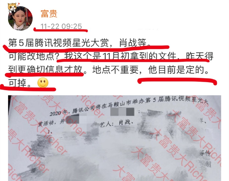自从肖战的电视剧上线播出后,他的知名黑粉大富贵就没有停止过搞工作,不竭地向其他黑粉透露肖战的资源行程。虽然是在抵制肖战,但从此前爆料的内容来看,大富贵的料真实性很高。近日,为了能举报掉星光大赏,大富贵也找到了新的方法,还将欲加之罪赋予了肖战。