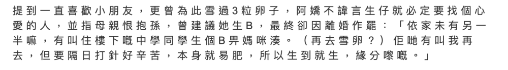 在和赖弘国没有婚变的时候, 曾一度被传怀孕。外界本以为是怀孕导致的发福,却没想到是冻卵导致的副感化。她喜欢小朋友,可是却没能和赖弘国拥有,或许彼此都知道婚姻不会长久吧。