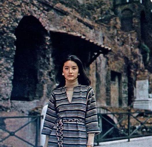 林青霞的审美眼光真不是一般人,在那个时代就已经get到了“叠穿”的精髓,外搭条纹样式的连衣裙,小小的V型开叉能够起到修饰脸型的作用,内搭一件高领针织衫,层次感雄厚又特别能衬托优雅气质,显得精致又高贵。