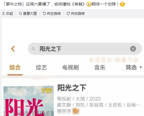 这部剧在前期的宣传特别的多,所以是一向备受观众们期待的一部作品。但是也有网友发现了,这部《有翡》在播出时,竟意外撞档了另一部新剧。这部剧比《有翡》并不弱些甚么,反而更受大家的期待,这部新剧就是由知名小说《掌中之物》翻拍的《阳光之下》。