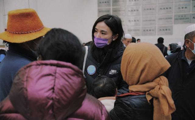 两位女士都穿着黑色的羽绒服,李嫣在一旁一边玩手机,一边将目光投向李亚鹏,海哈金喜则在他们对面站着,挎着一个深绿色的包包。