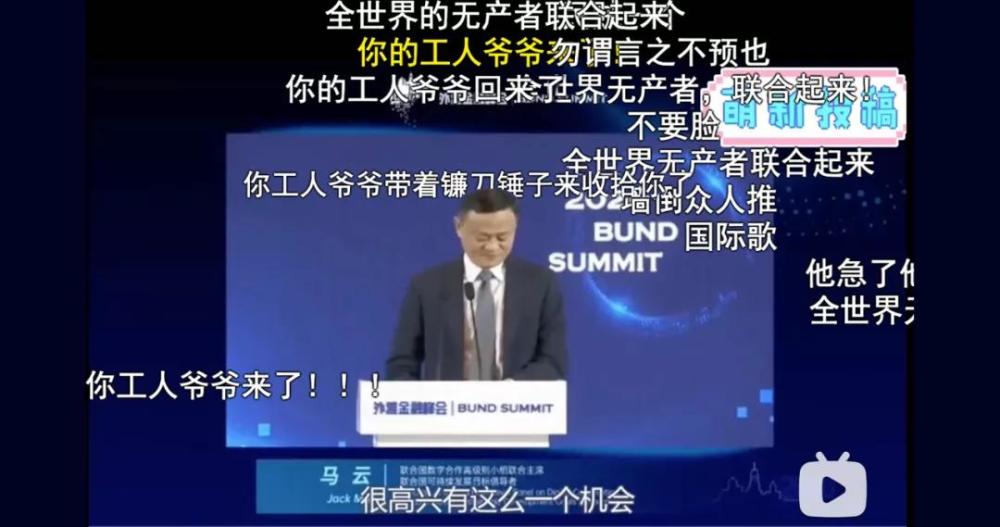 前两年B站上关于马云的视频里,最多的弹幕是“马云爸爸”;而包括蚂蚁金服在内的一系列事件之后,现在在B站打开马云的视频,你能看到满屏幕的“你工人爷爷来了”。