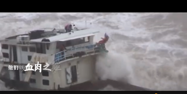 在短片中,能看到许多惊心动魄的场面:救捞员攀着直升机的救援绳靠近失事船舶时,突然有大浪扑来,将其吞没;在救援过程当中,所有的救捞员都被巨浪扑倒在甲板上;失火的游轮上,救捞员被喷得满身泡沫依然不屈不挠地往火海里冲……