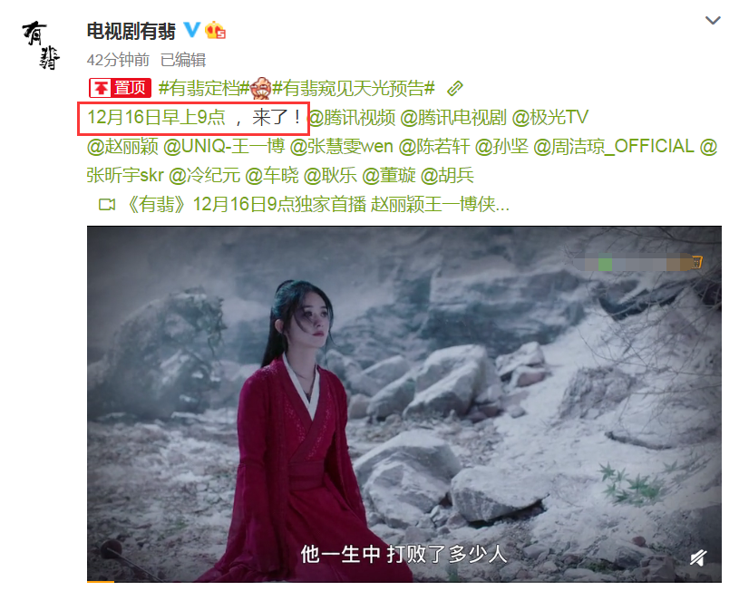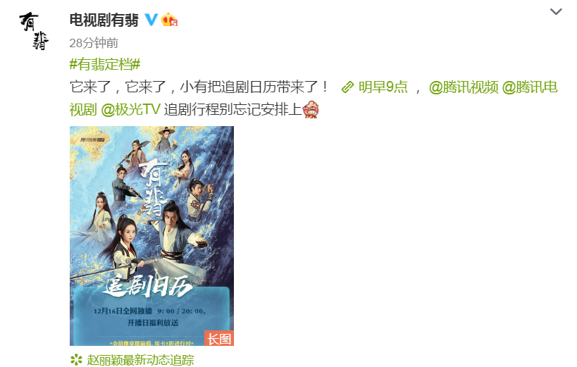 下昼《有翡》的官博宣布了《有翡》定档,定档的时间就是12月16日早上九点。16日也就是明天了,也就是说明天《有翡》就要来了。大家在看到这个消息以后,是否是超惊喜了呢?