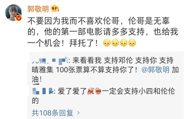 近日,郭敬明再次在自己的微博上为新片宣传,不过却掀起了一波争议,微博原文“不要因为我而不喜欢伦哥,伦哥是无辜的,他的第一部电影请多多支持,也给我一个机会,拜托了!”。