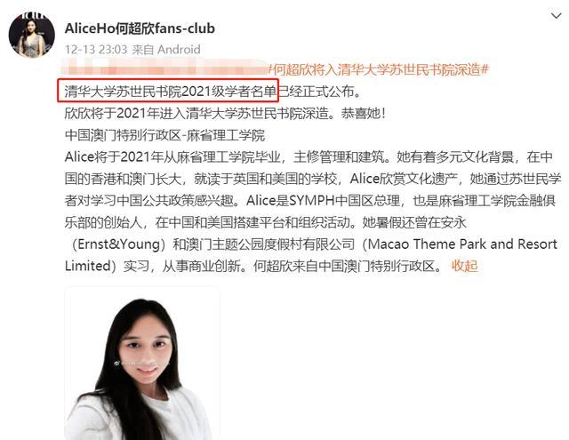 12月13日,有媒体曝出何超欣将于2021年入学清华大学的消息,她还获得了苏世民奖学金,全球四分之一的荣誉,可以说是又为赌王家族争光了,还为四太省下了一笔学费。