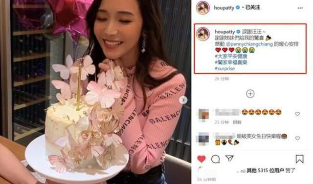12月15日,女星侯佩岑在社交平台上晒出一组好姐妹提前庆祝她42岁生日的照片,照片中侯佩岑正对着蜡烛许愿,并配发文字称'泪眼汪汪,谢谢姐妹们给我的惊喜'。