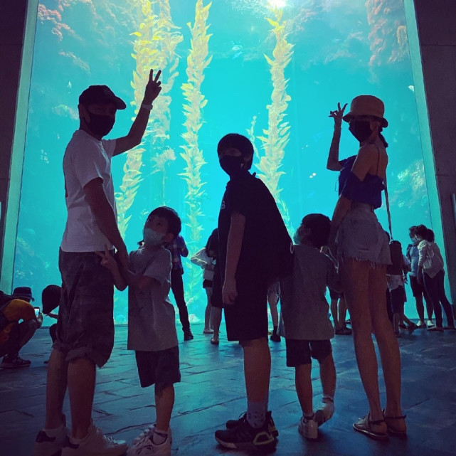 身后的林志颖一手搭在老婆肩上,另一只手则搂着大儿子Kimi,作为不老男神的他依旧年轻感十足,与陈若仪怎么看都般配。