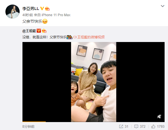 在2017父亲节的时候,王祖蓝和李亚男甜蜜宣布二胎的喜讯,方式也是充满了创意,一家四口拍摄了一个小视频,女儿指着妈妈的肚子喊着“baby”,可爱的G宝就要荣升成为姐姐了。