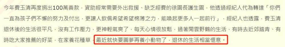 而费玉清也通过经纪人转达了对该爱心团体的支持与信任。同时,经纪人也透露了费玉清的退休生活近况,称费玉清现在非常享用平凡的惬意生活,接下来还准备领养小动物。