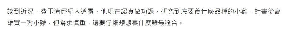 即便如此,费玉清爱狗成痴的初心一向未变。未婚未育的他曾养了一只吉娃娃当'干女儿',后来爱犬离世后他十分伤心,甚至不敢再养狗。2019年11月,在他的封麦演唱会前夕,经纪人透露费玉清退休后准备养鸡,还认真研究了鸡的品种,似乎并未打算养狗。