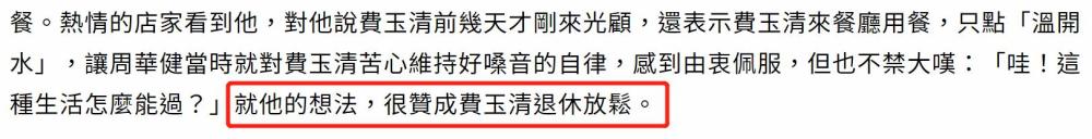 费玉清退圈虽然有些可惜,但对他来说或许是最好的放松方式。周华健受访时透露,为了保护嗓子,费玉清去餐厅吃饭只点温开水,让周华健直叹'这种生活怎么能过',让他非常支持费玉清退休。而费玉清在聊天中也曾表示自己封麦后熬夜、喝酒不再有所顾虑。