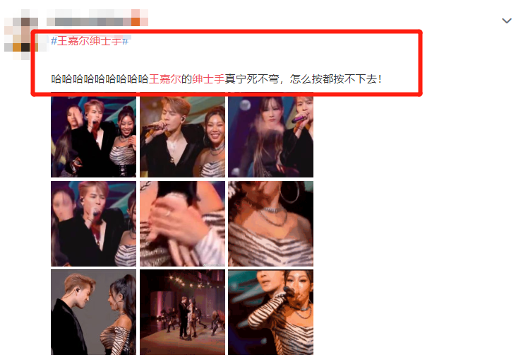 因为将手搭在Jessi的肩膀上,而手也是很容易就能够碰到Jessi的胸部,但是王嘉尔却并没有将手直接放下来,而是一向都将手绷直,这个状态想必也是很刻意了。