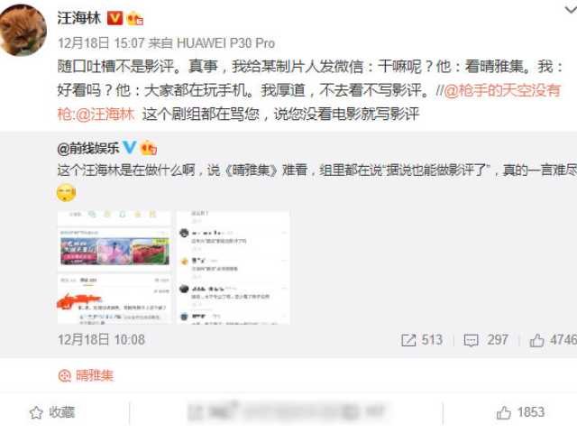 有网友和工作人员表示汪海林没看过电影就随便发影评让人一言难尽,但是汪海林对此也做出回应,表示他只是随口吐槽并不是影评……