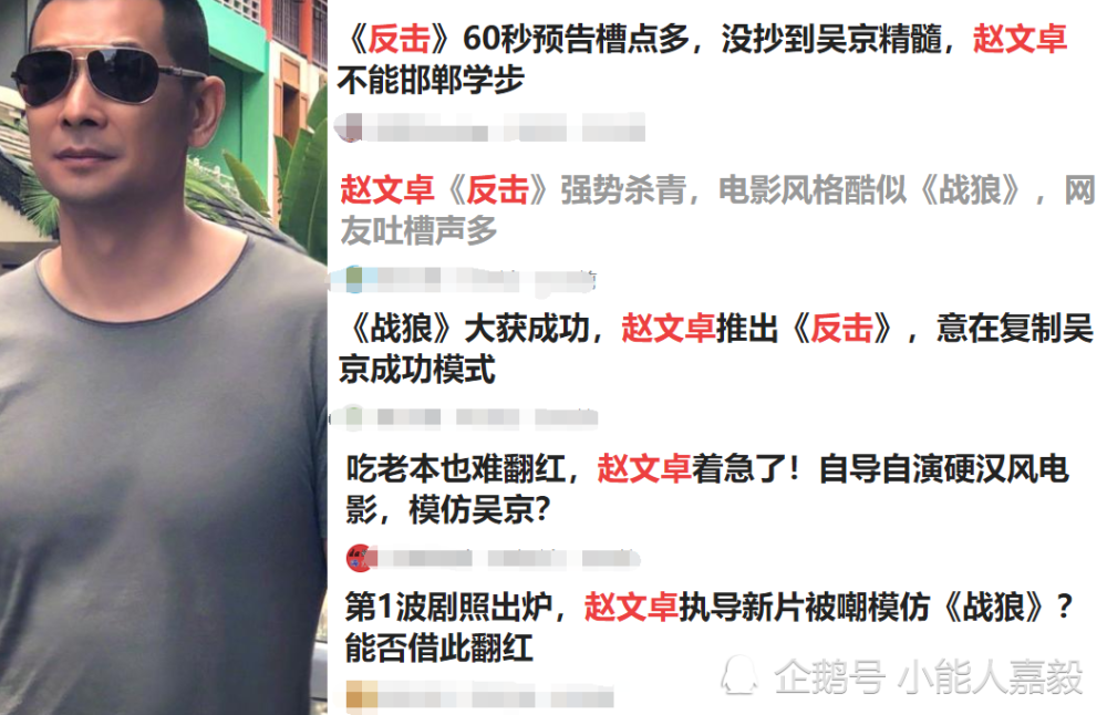到如今提到赵文卓也不再是那降妖除魔的帅气法海,而是皱纹横生毁了情怀的黄飞鸿,或也是粉丝们的心声被赵文卓所听到终因而不再挑战经典了,也学着吴京一样做导演拍摄自己所擅长的功夫电影,但电影还未上映就引得网友们的质疑是在蹭《战狼2》的热度,毕竟赵文卓首次指导的《反击》在剧情上也是有和《战狼2》相似之处。