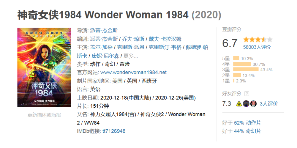 笔者就是神奇女侠入的DC坑,所以在一开始就以为内地观众都很期待这部电影,即使是现在这种口碑但是7的情况,笔者依旧对《神奇女侠1984》非常喜欢。