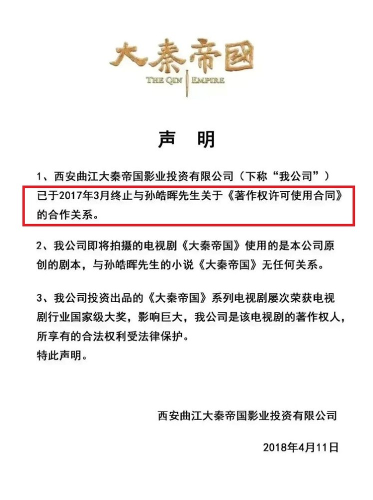从电视剧制作方2018年4月声明可以看出,原著作者孙皓晖已于2017年3月终止与孙皓晖先生关于《著作权许可利用合同》的合作关系。可是《大秦赋》是2018年8月开始拍摄的,这个时间已经没有版权了,所以说第四部跟《大秦帝国》原著关系不大,可以说完全是新创作的剧本。