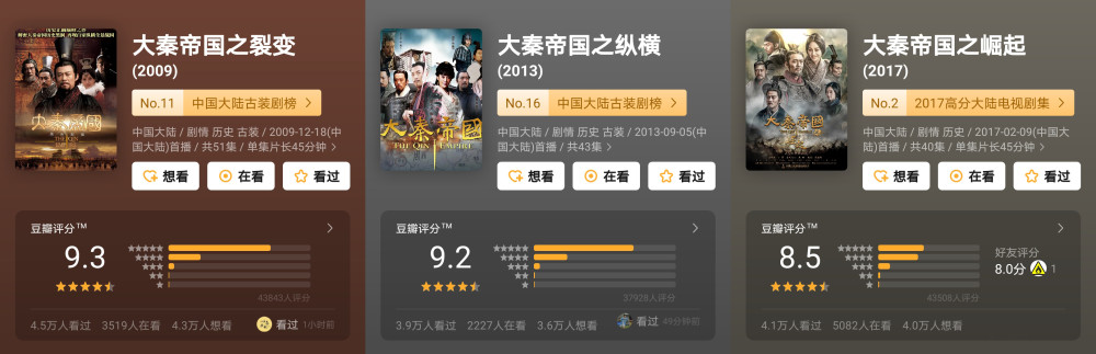 《大秦帝国》这个电视剧系列IP,我想很多观众看过或者领会过,这部剧从2009年首播至今,已经过去了十一年。2009年《大秦帝国之裂变》,2013年《大秦帝国之纵横》和2017年《大秦帝国之崛起》,已经上映的大秦帝国三部曲相信不少观众都有看过。三部平均豆瓣评分高达9.0。