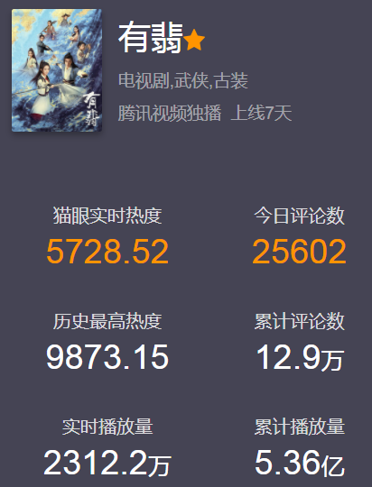 《有翡》线上的播放量最为惊人,它是国内最快破亿的剧集之一,目前它的热度继续蝉联全网第一。截止15点24,实时播放量2312万次,上线7天累计播放量破5.36亿次。只在一个平台播出就这么牛,赵丽颖的号召力太强大了,她真不愧是电视剧圈的“一姐”。