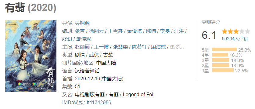 《有翡》从已播出的十来集看,该剧的质量是很不错的,剧中有精彩的武打场面,特效也是相当给力。这部剧在豆瓣上目前只有6.1分,这里面很大成分是一部分人恶意打低分拉低的,有22.5%的人故意打一颗星。退一步来讲,即便本剧的口碑南北极分化,如今它也用爆棚的收视率做出回应了。