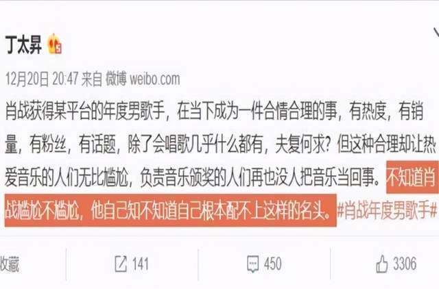 虽然肖战目前的人气很高,但是质疑的声音却从未减少。这次因为星光大赏的“年度男歌手”颁奖,肖战又遭到了著名乐评人丁太升的炮轰,他直接表明肖战配不上这个名头。