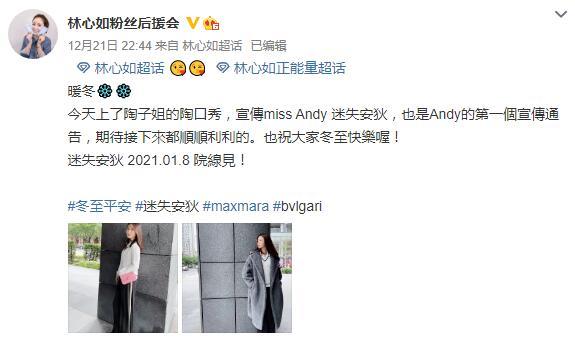 当天,林心如是去出席自己新电影《迷失安狄》的记者会。同场出席的还有陶晶莹和李李仁夫妇。