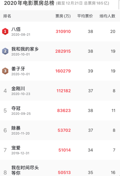 还是先来看一看今年全年总体票房表现吧,截止到目前,今年票房破10亿的作品共四部,分别是《八佰》《我和我的祖国》《姜子牙》和《金刚川》,其中吴京主演了三部,票房影响力不服不可。票房破5亿的共5部作品,我们就不逐一列举了。