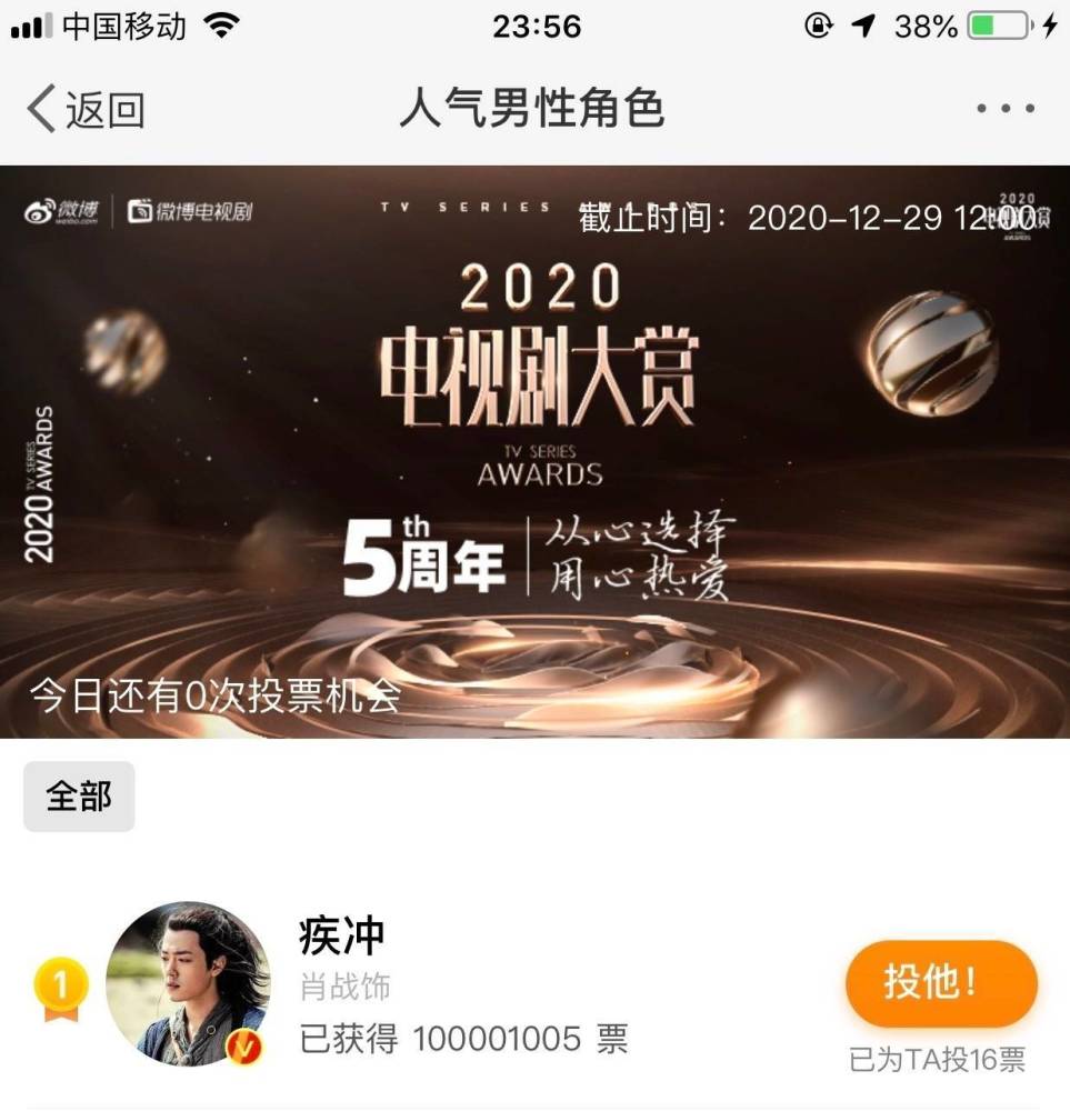 这也是在电视剧大赏中,唯逐一个破亿的男性角色,在榜首遥遥领先第二名9000万票。